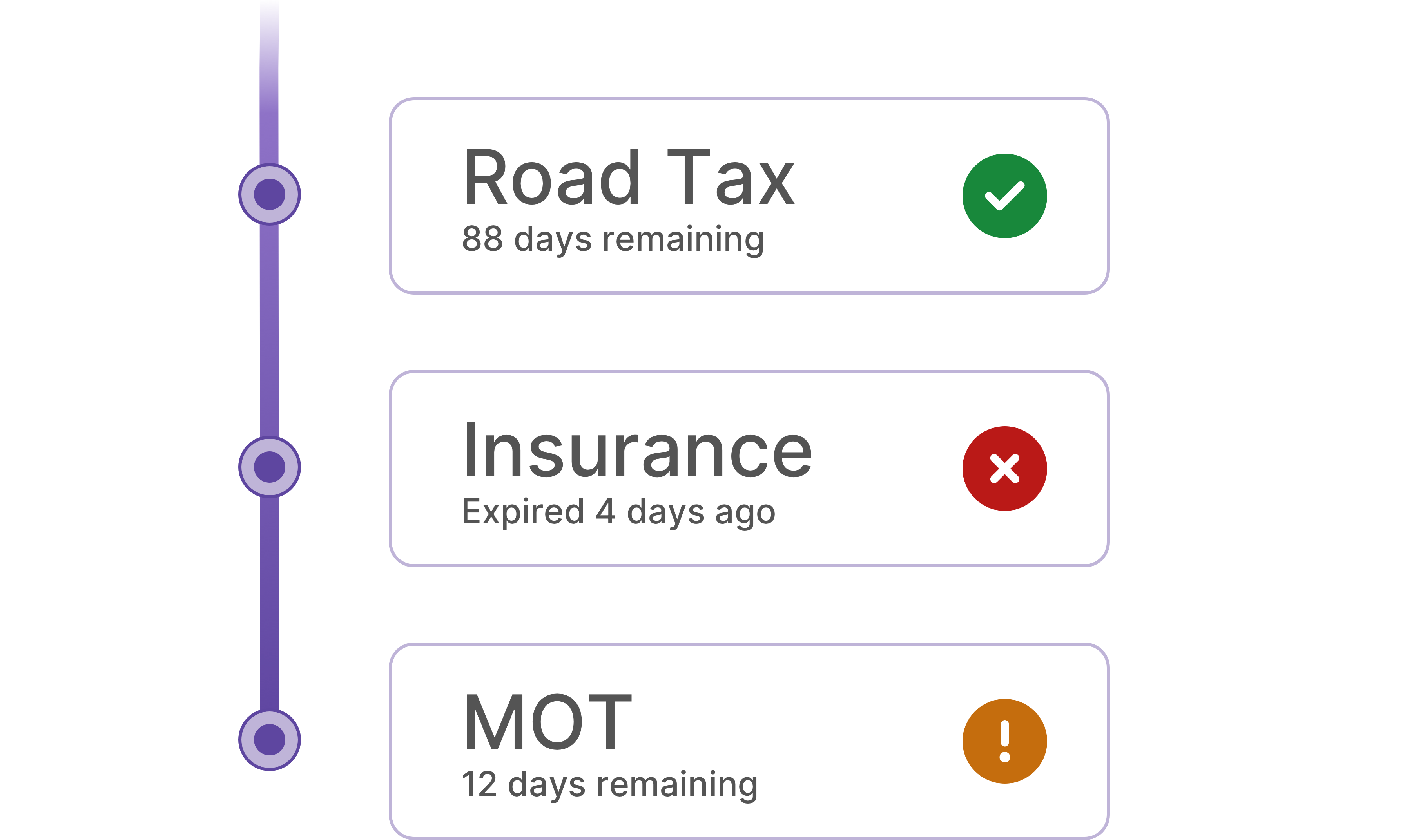 Using DVLA live data, we keep on top of your MOT and road tax, and you don't have to do anything. We will let you know when you need to take action.